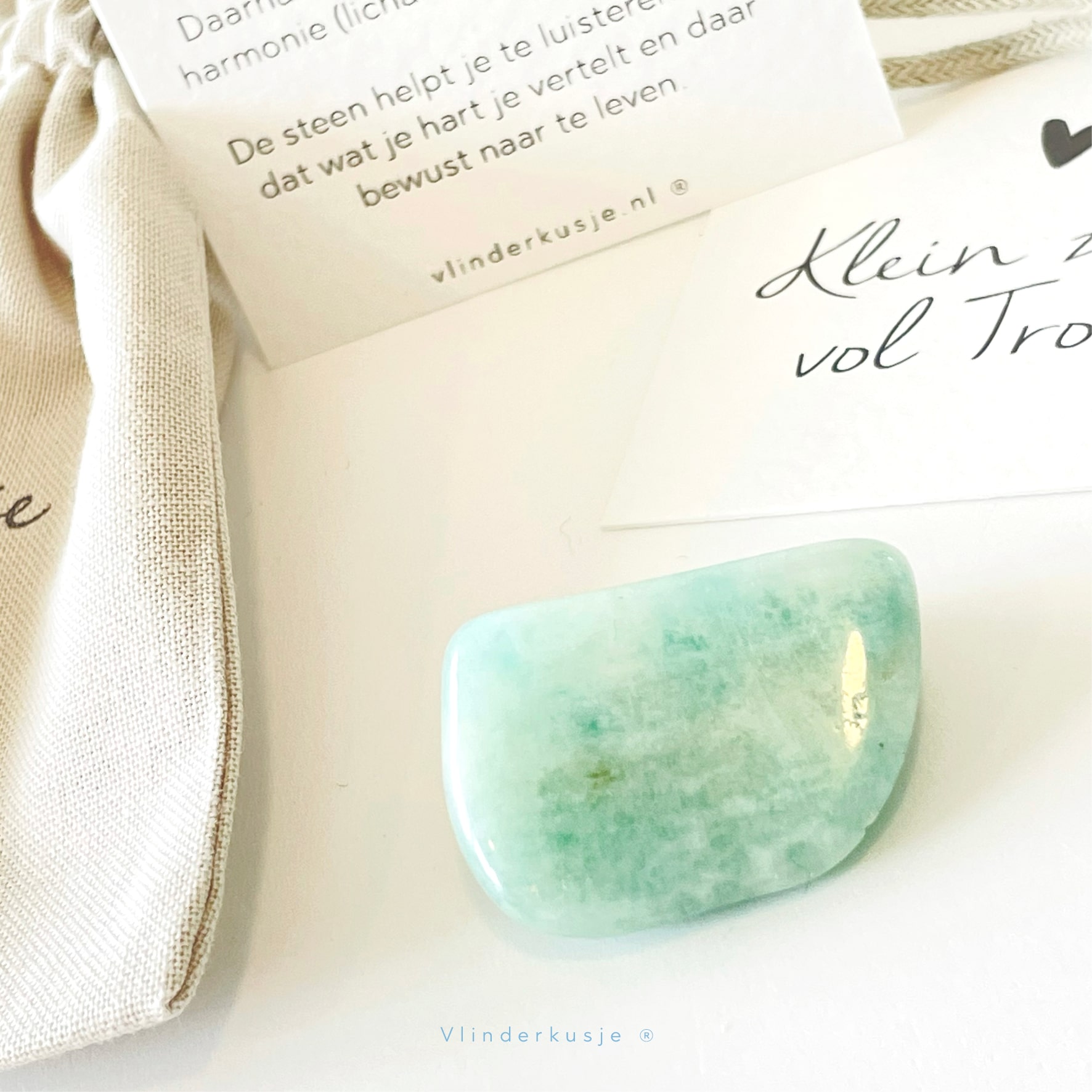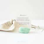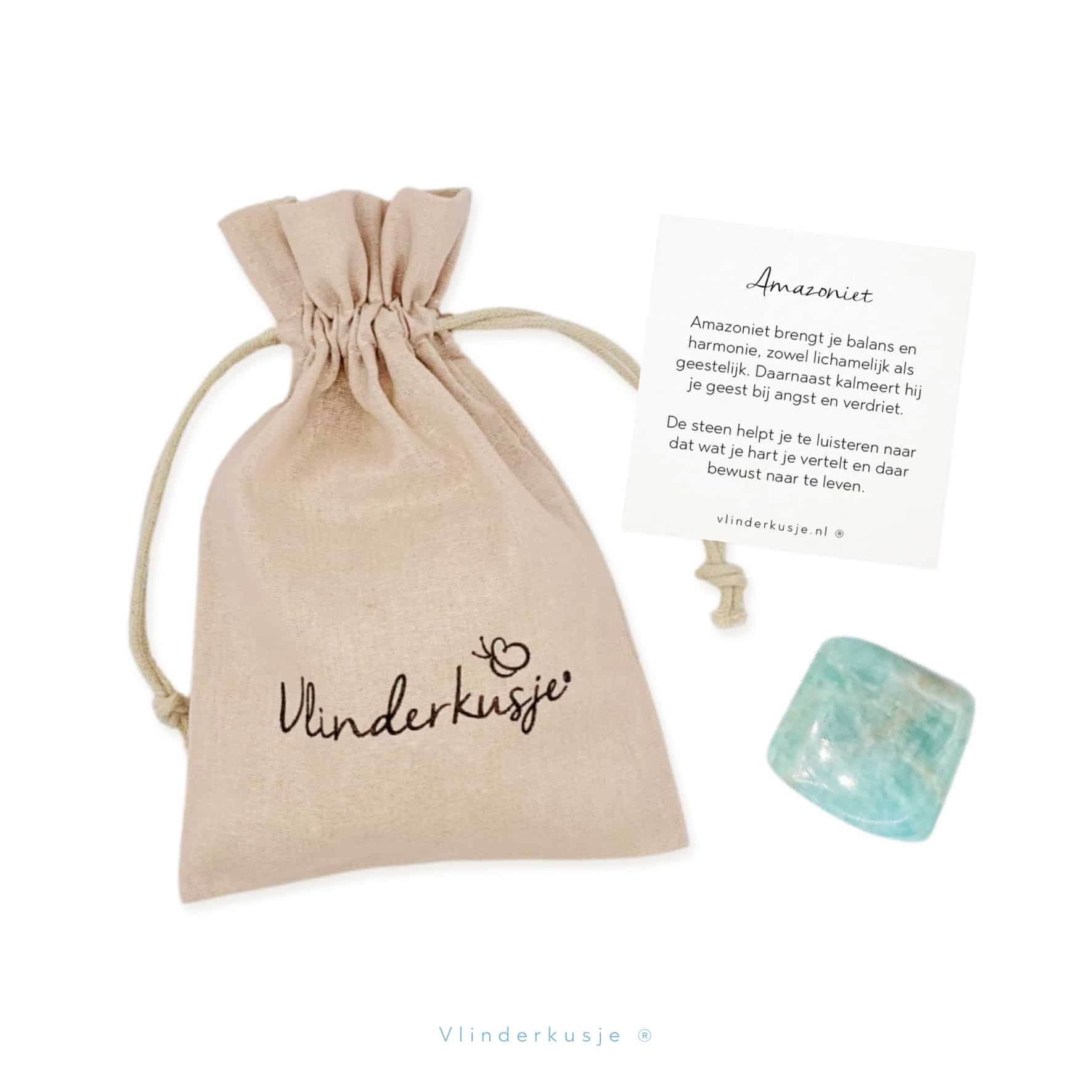 Een zakje van ecologisch katoen (9x12 cm), een edelsteen en een mini kaartje met uitleg over de steen. |