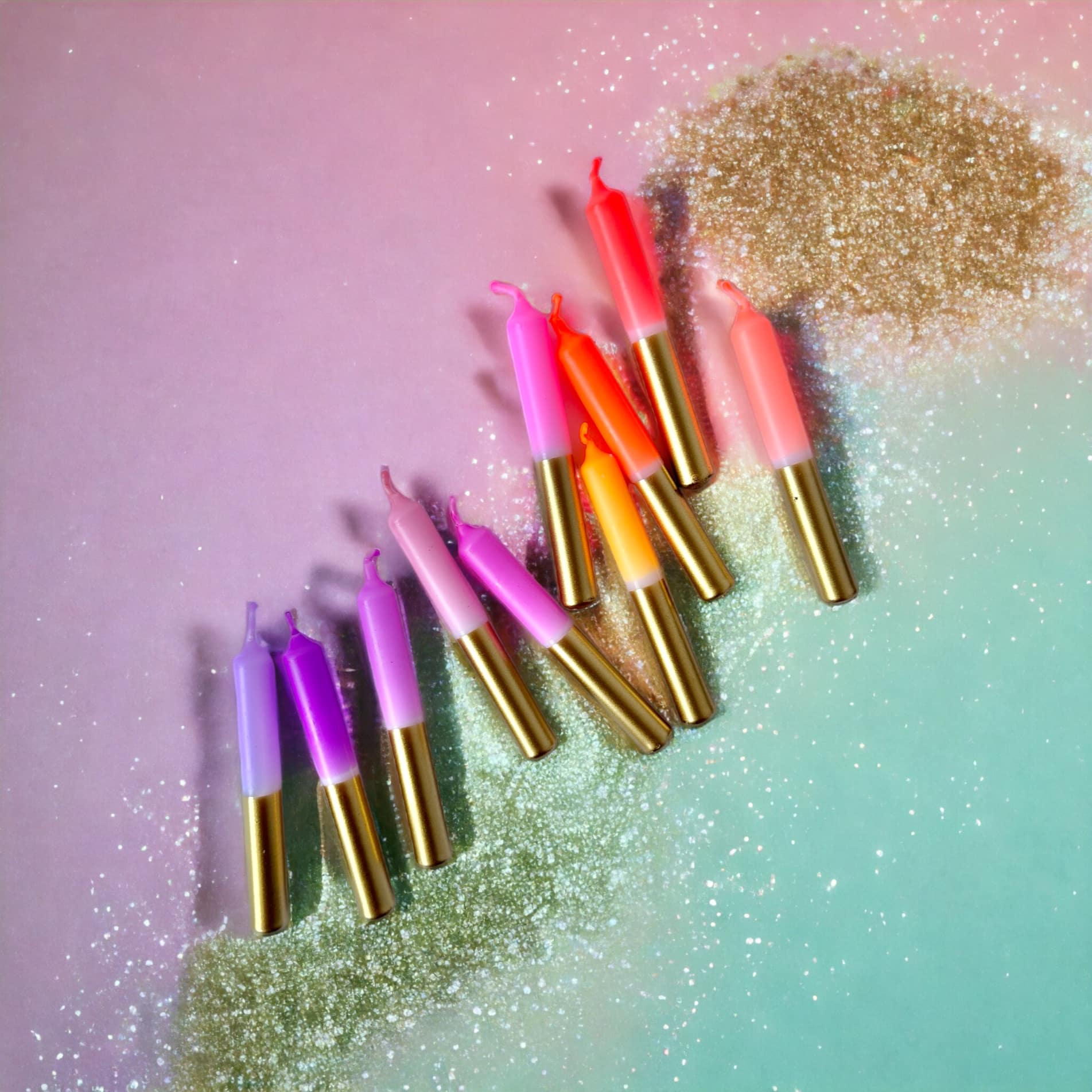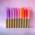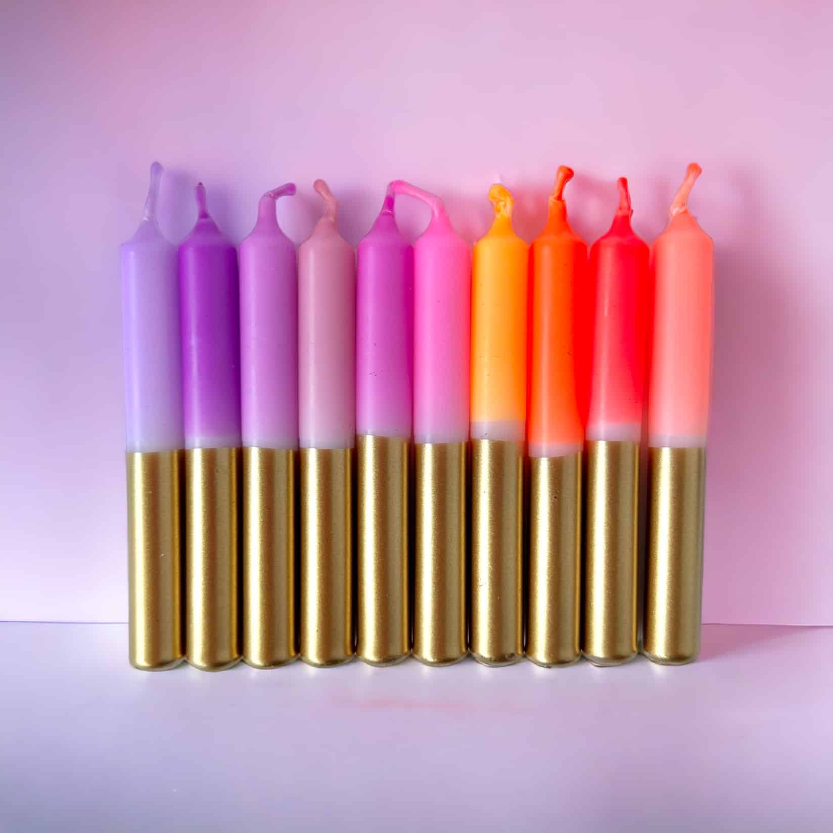Handbedrukte kaarsen in felle neonkleuren. Prachtige set van drie stokkaarsen verpakt in een doos van Gmund-natuurpapier met metallic reliëf.