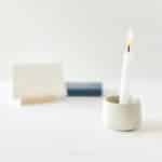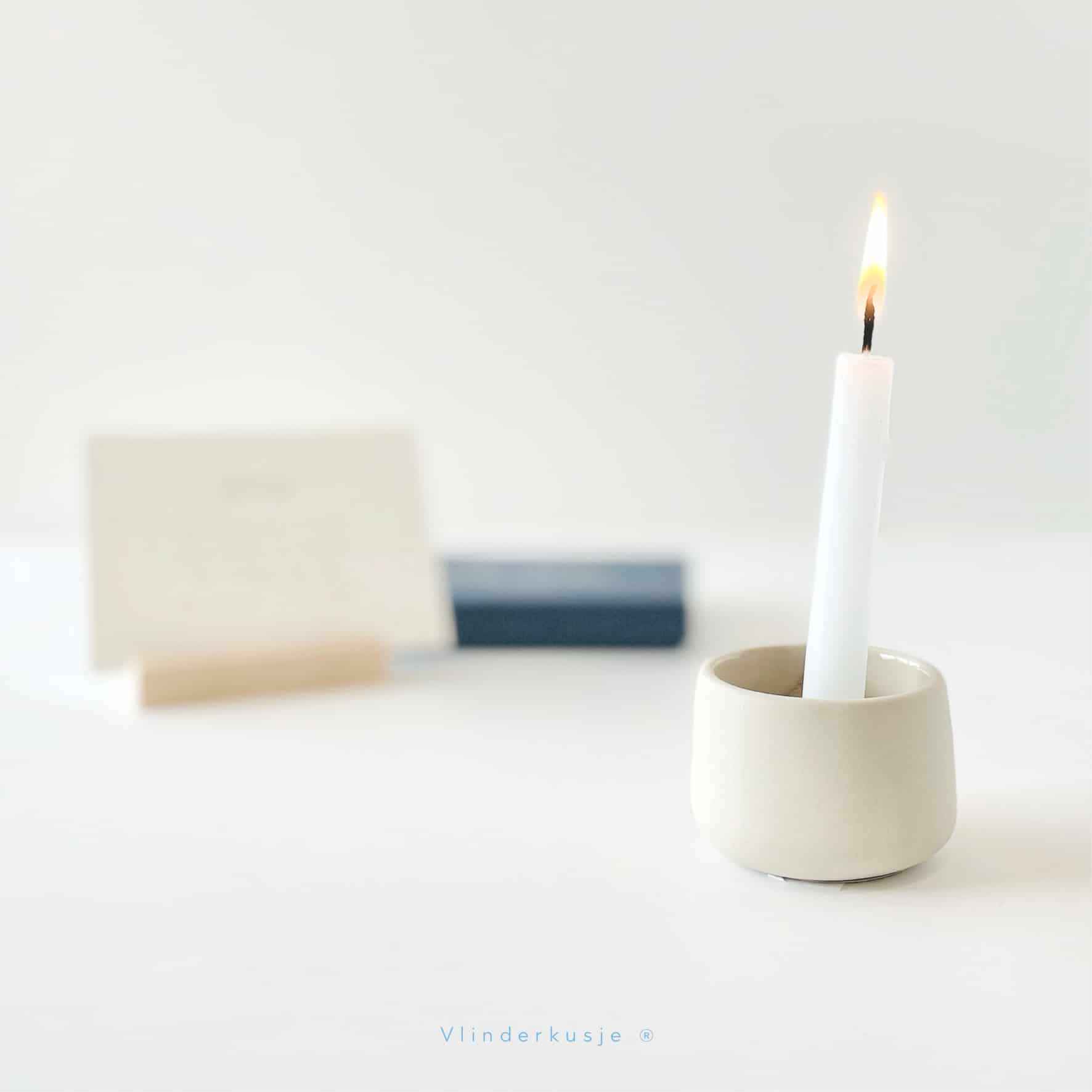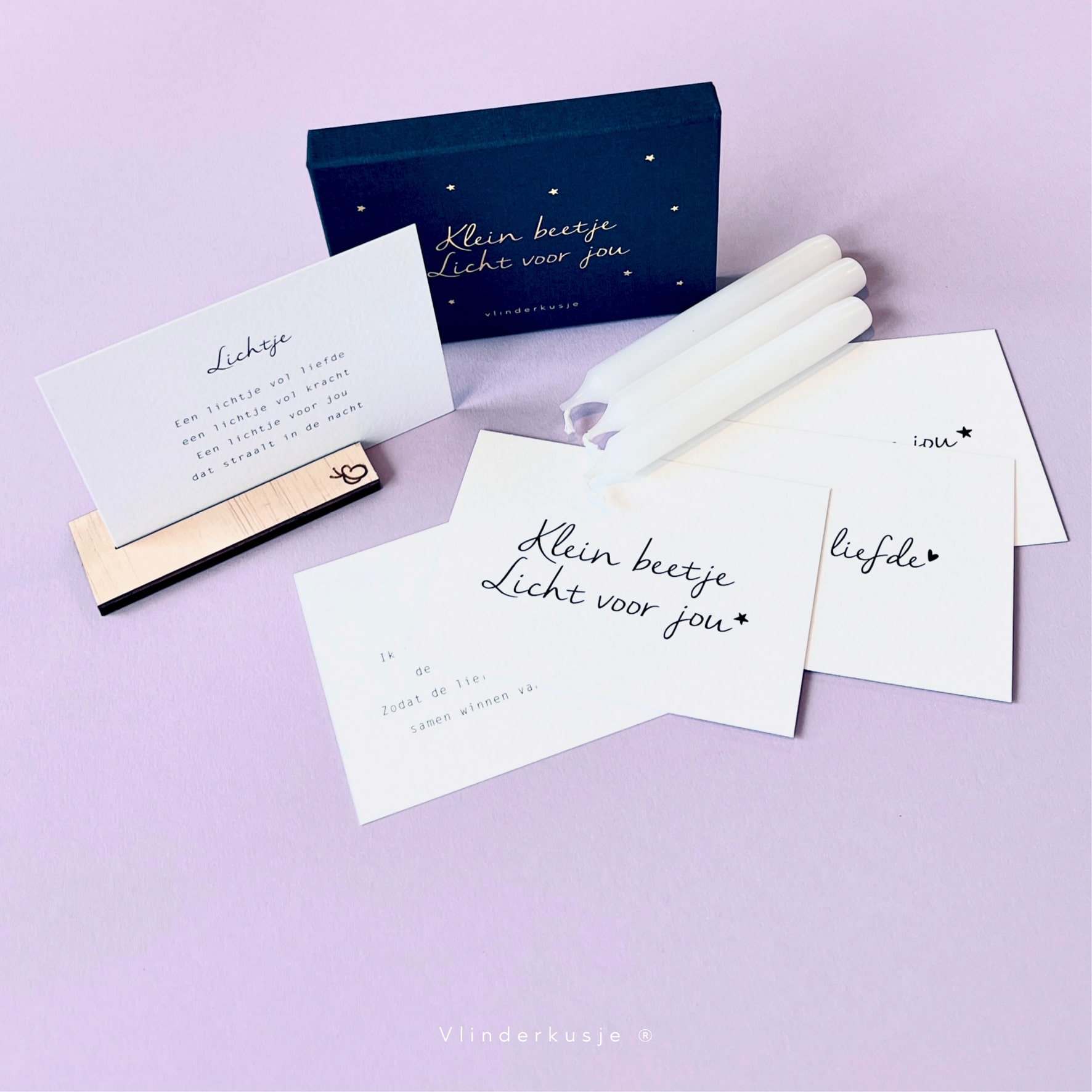 Drie potloodkaarsjes, vijf kleine kaartjes met lieve teksten en gedichtjes, en een houten houdertje voor de kaartjes. |