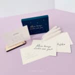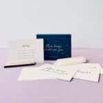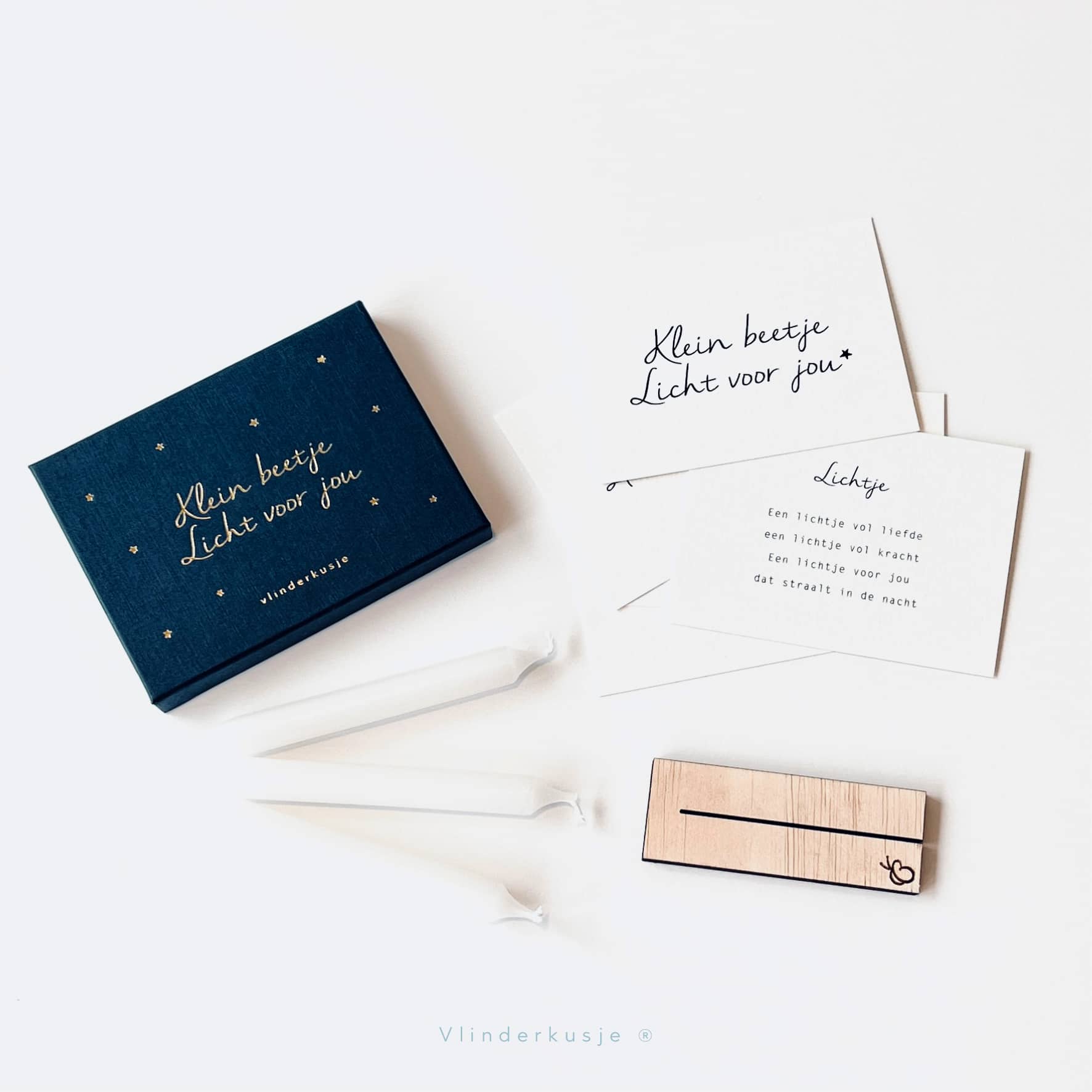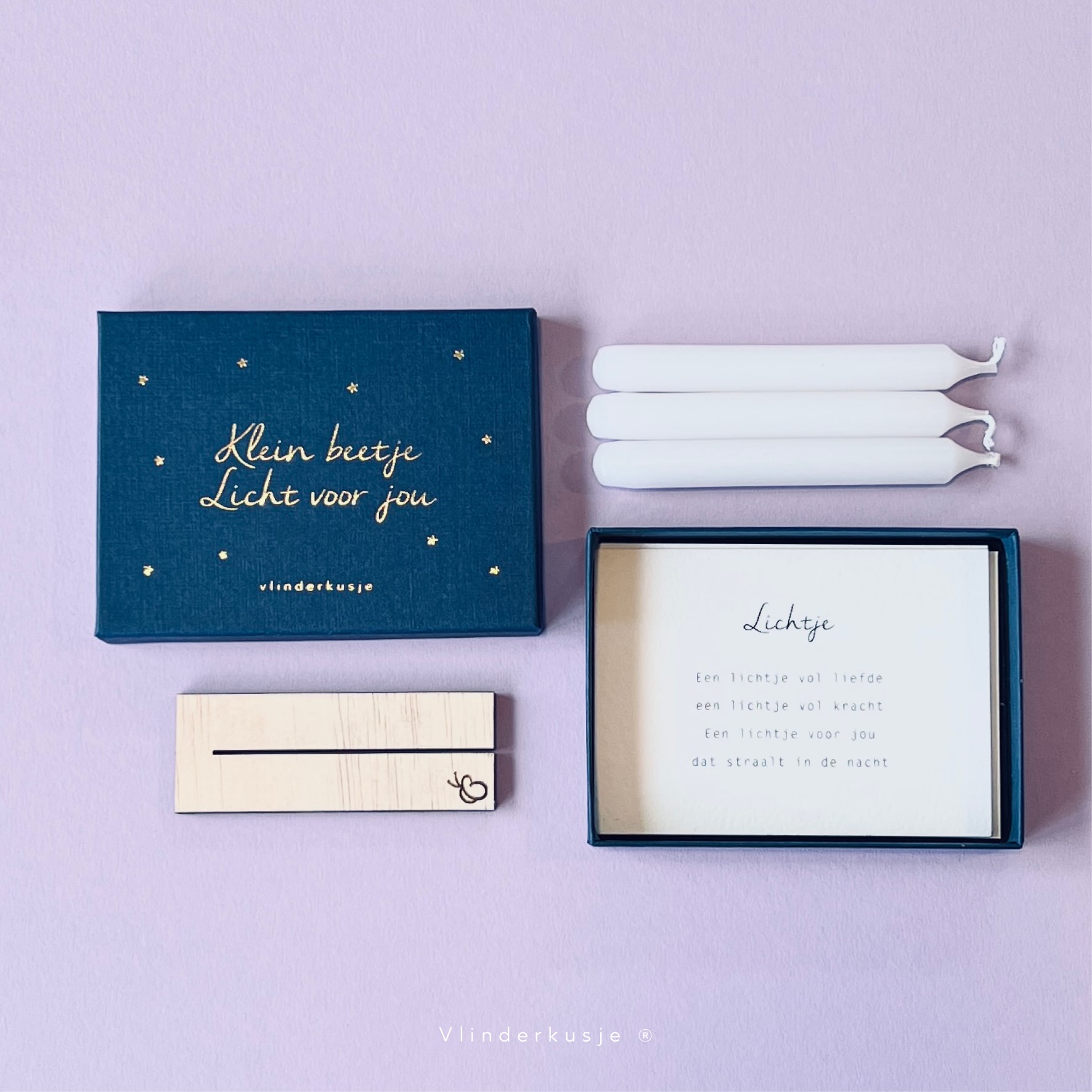 Donkerblauw doosje met in gouden letters de tekst 'Een klein beetje licht voor jou'. |