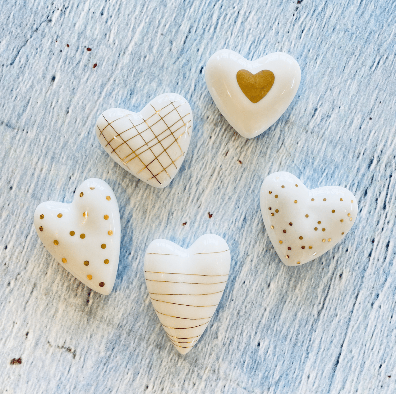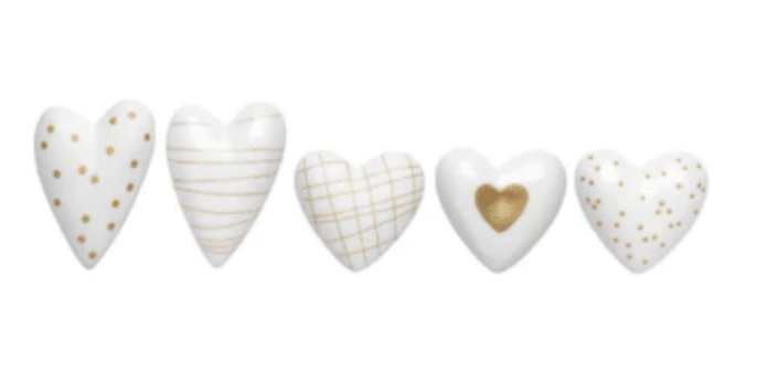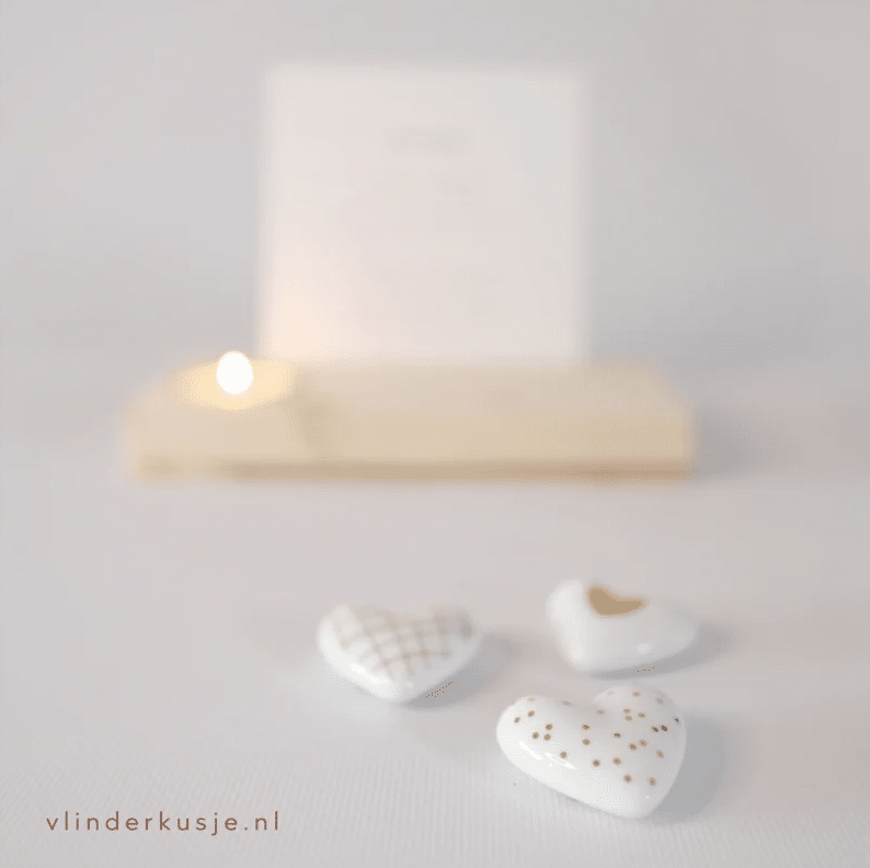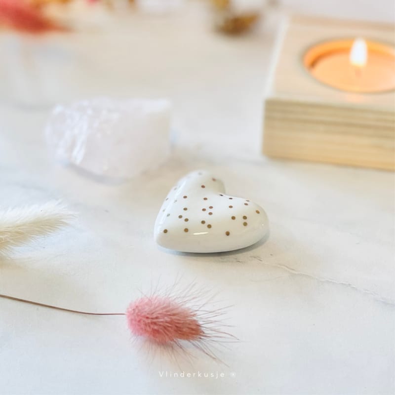 Een hartje van keramiek, voor bij een gedenkplekje. Het hartje heeft gouden details en is van het merk Räder. Ze worden assorti geleverd in 5 verschillende designs. De hartjes zijn ongeveer 3 cm groot en worden geleverd in een klein organza zakje.