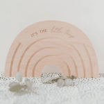 Gedenkplankje in de vorm van een regenboog met een lieve tekst. Je kunt de plank neerleggen met kleine schatten en kaarsjes erop, maar je kunt hem ook rechtop zetten op een mooi plekje in huis.