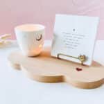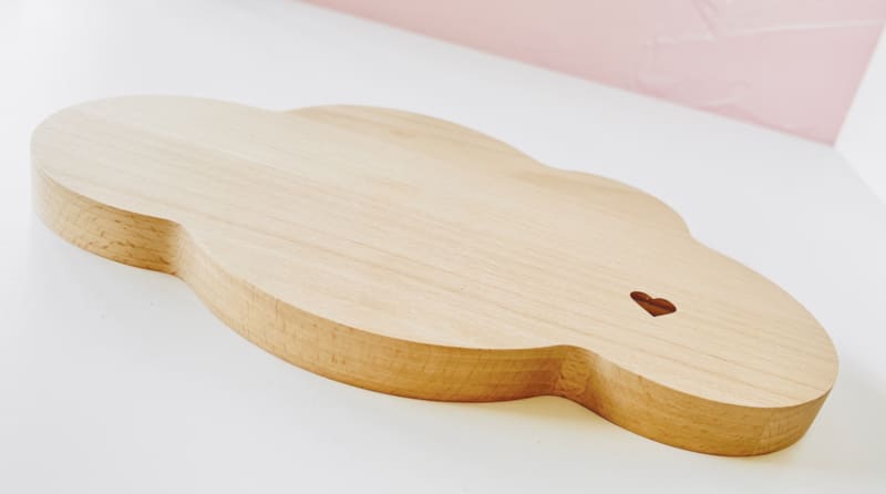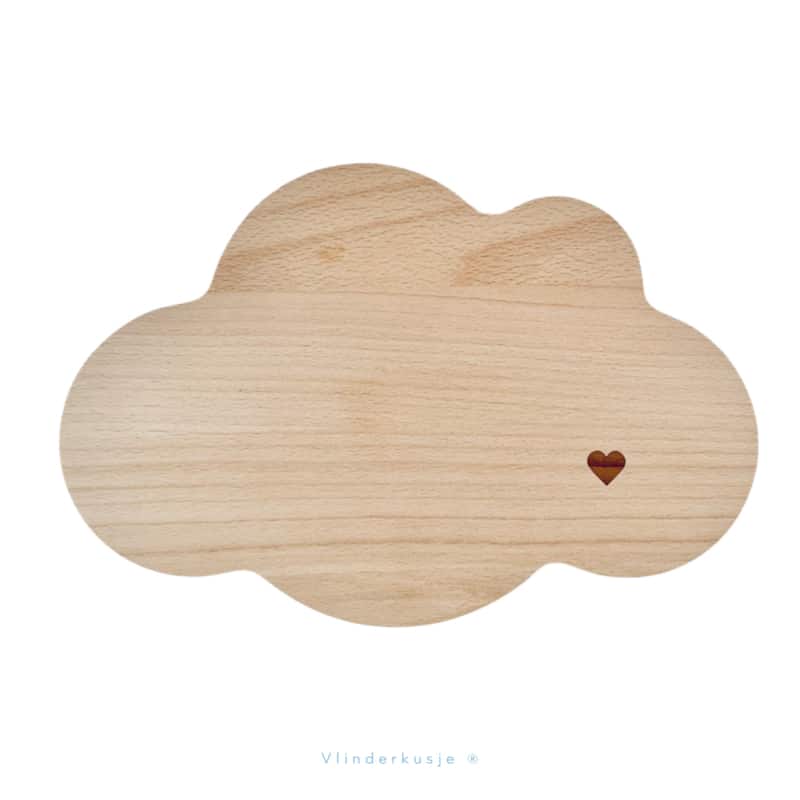 Gedenkplankje in de vorm van een wolk met een hartje. Je kunt de plank neerleggen met kleine schatten en kaarsjes erop, maar je kunt hem ook rechtop zetten op een mooi plekje in huis.