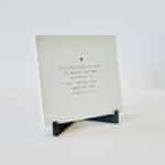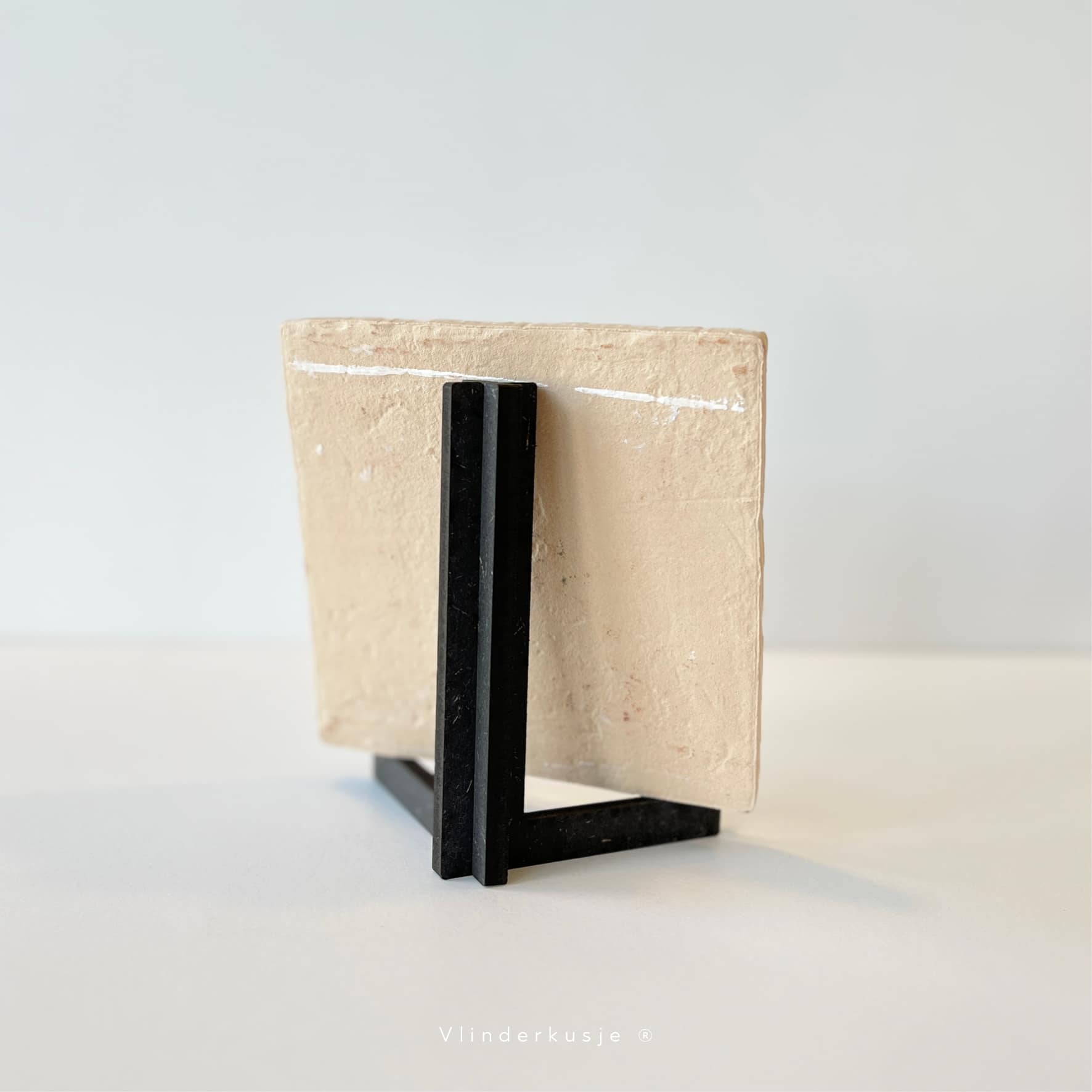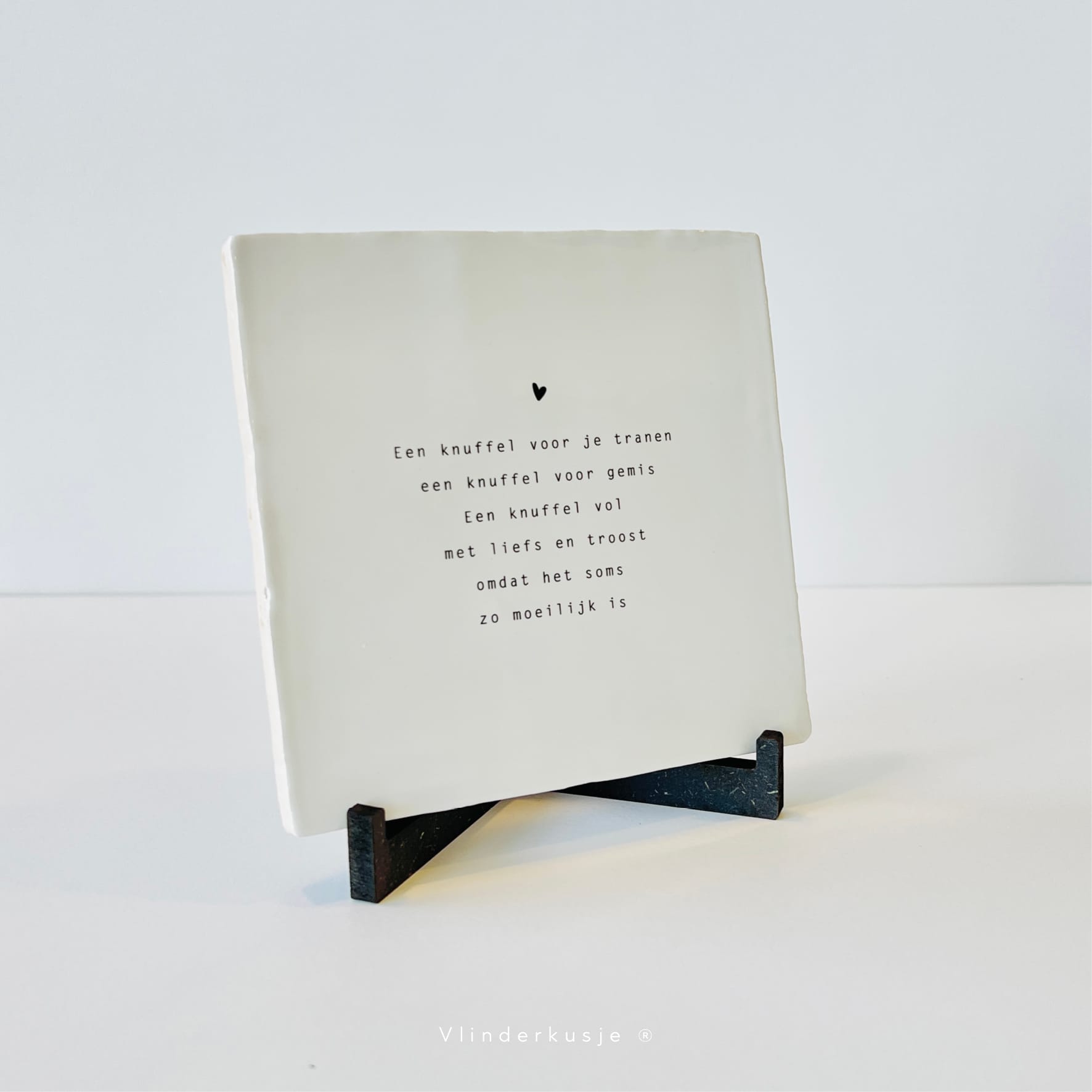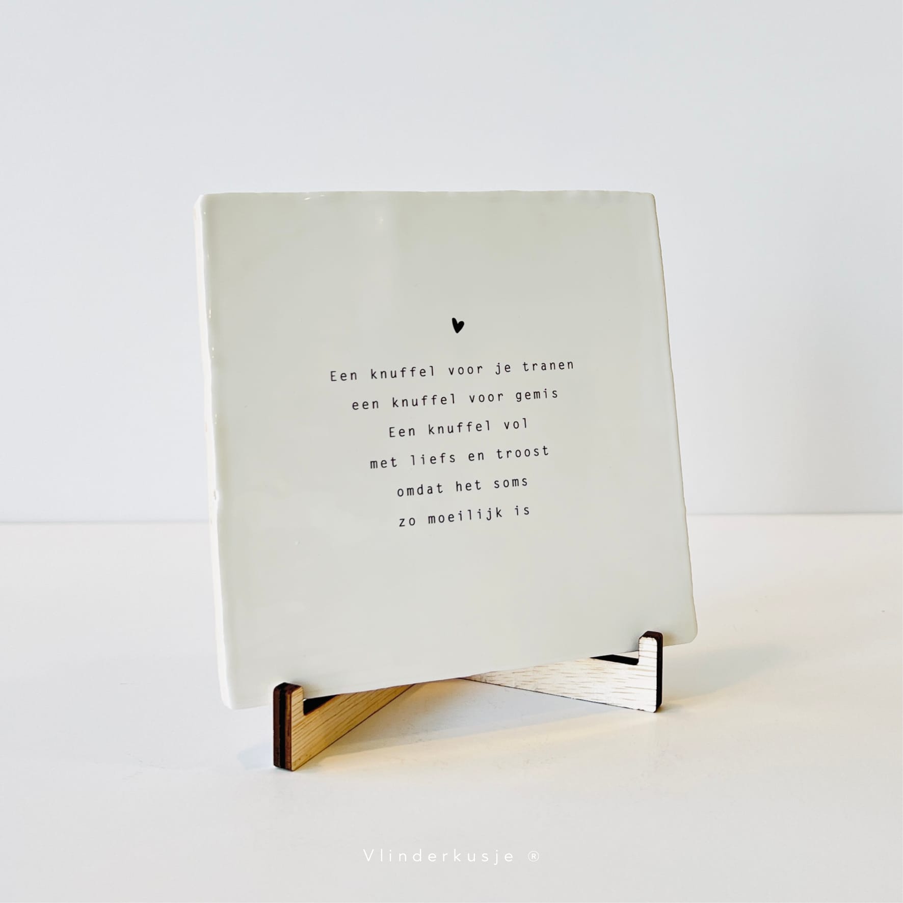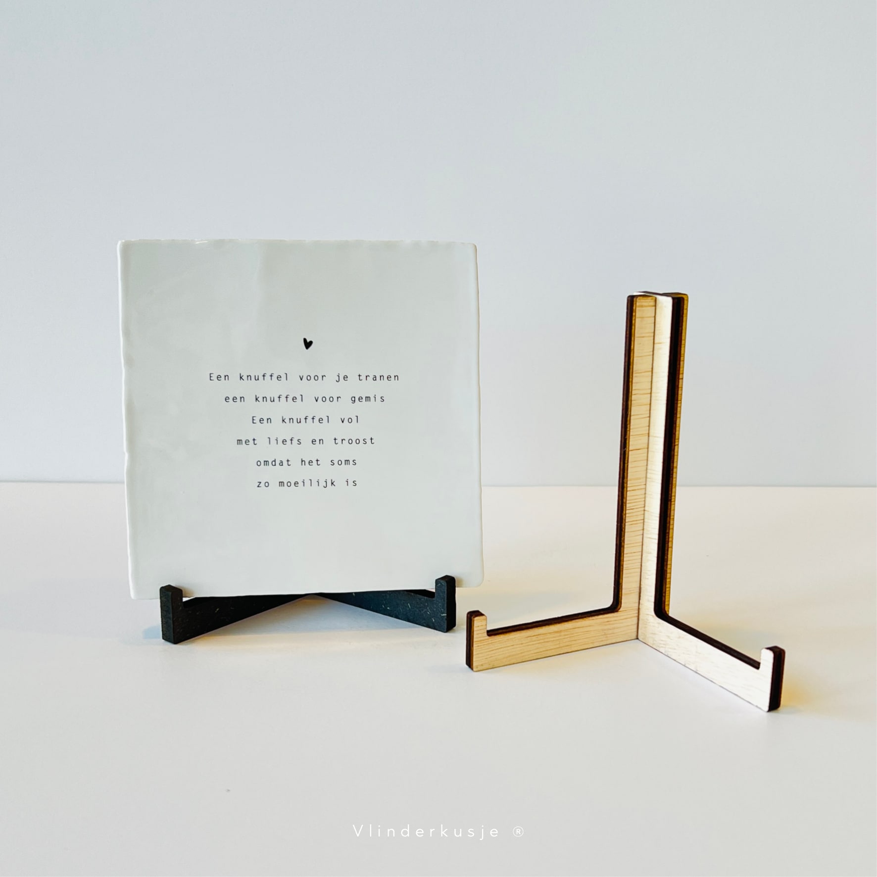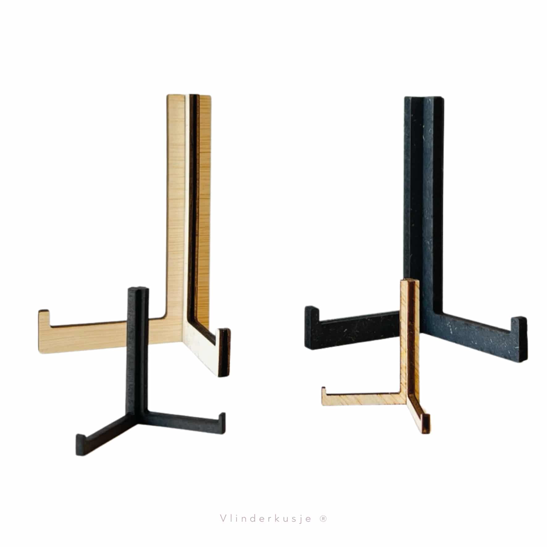 Houten standaardjes voor de troosttegels. De standaard komt in twee delen die je zo in elkaar kunt schuiven. De standaard is geschikt voor de troosttegeltjes van Vlinderkusje van 13 x 13 cm groot