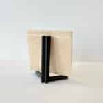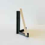 De houder is van hout en beschikbaar in twee kleuren; naturel of zwart.