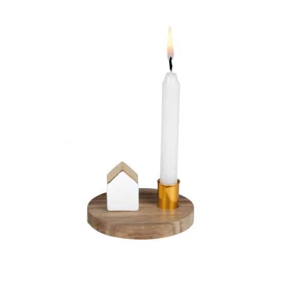 Prachtige kandelaar met een klein huisje van keramiek, voor kleine potloodkaarsjes.
