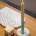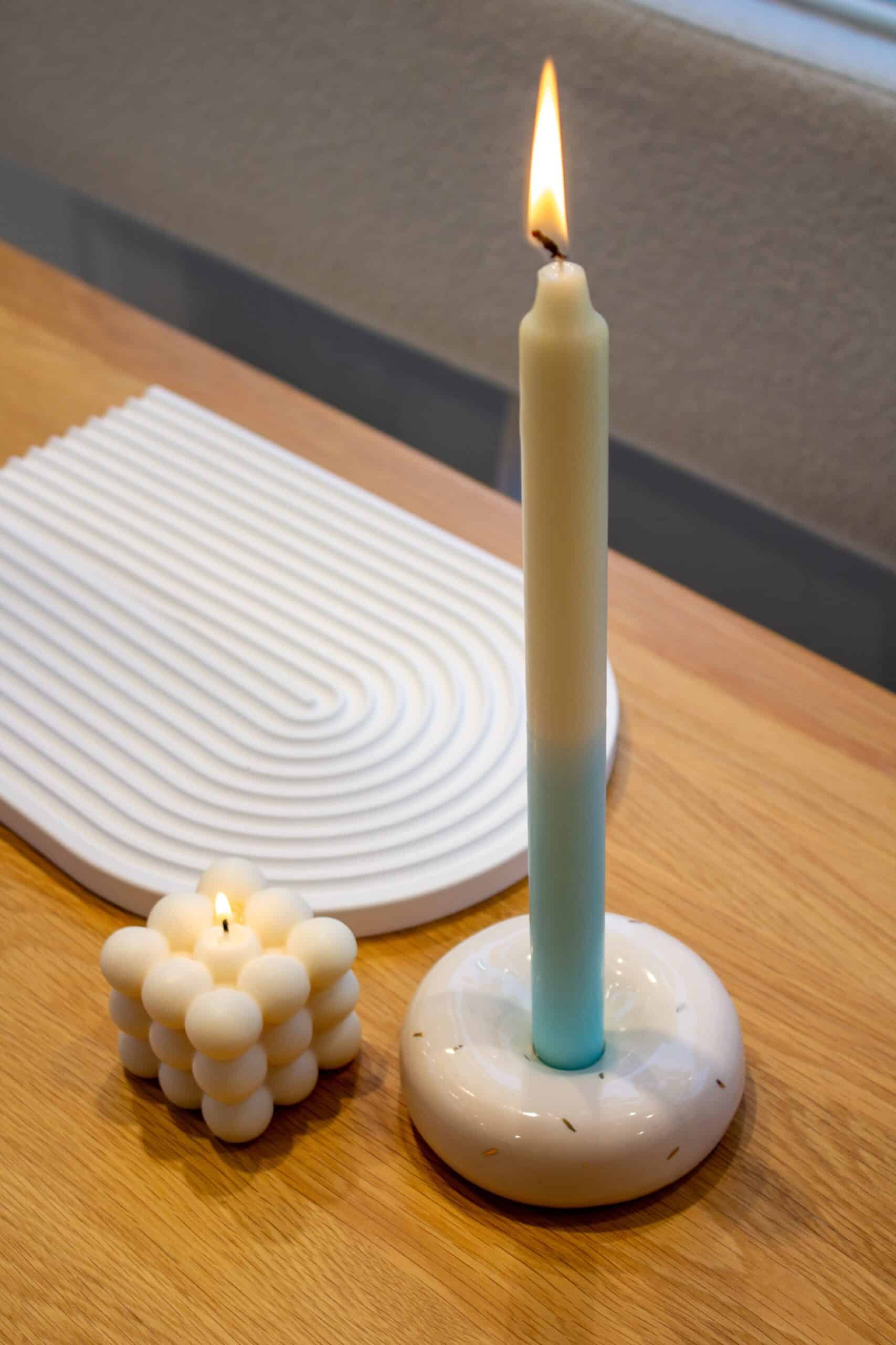 Deze kandelaar is handgemaakt door Amber van ‘Aesthetic Studios’ uit Nederland in samenwerking met ‘By Vivi’. De kaarsen zijn gemaakt van klei en stuk voor stuk uniek.