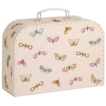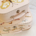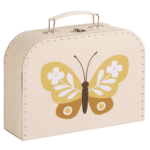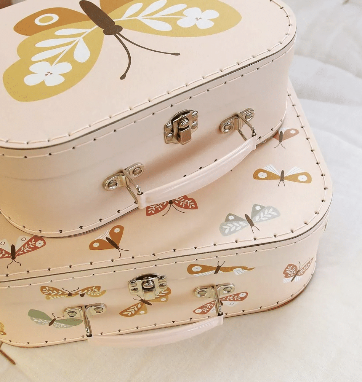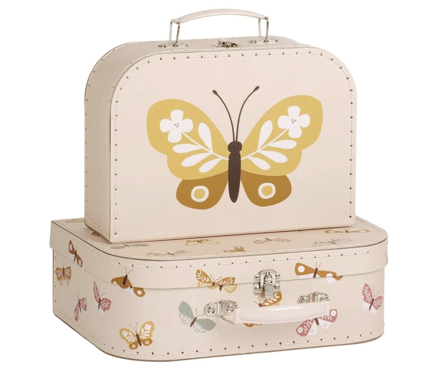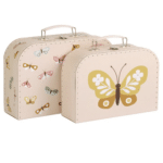 Deze set van twee koffertjes met vlinderdesign komt in twee verschillende formaten en zijn gemaakt van stevig karton met polyester stiksels. Zowel het grote als kleine koffertje hebben een metalen handgreep en gesp waardoor kleine schatten bewaard zullen blijven.