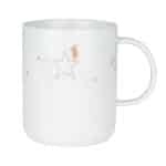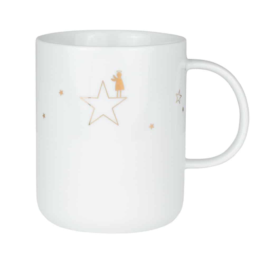 Een mok van keramiek met goudkleurige sterretjes en een engeltje.
