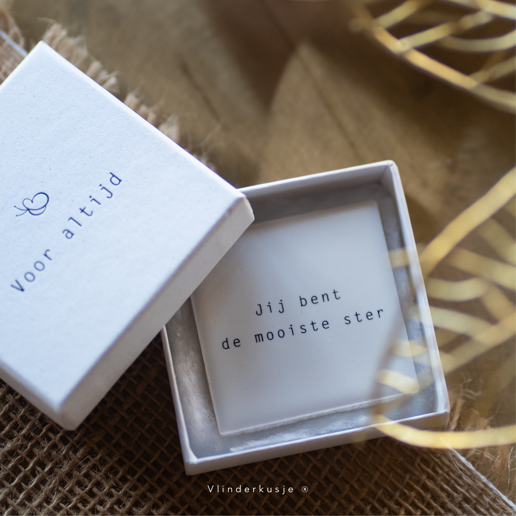 Prachtige mini troosttegel van Vlinderkusje. Kies voor een geschenk doosje erbij om het troosttegeltje helemaal af te maken en om het kado te geven aan een dierbare.