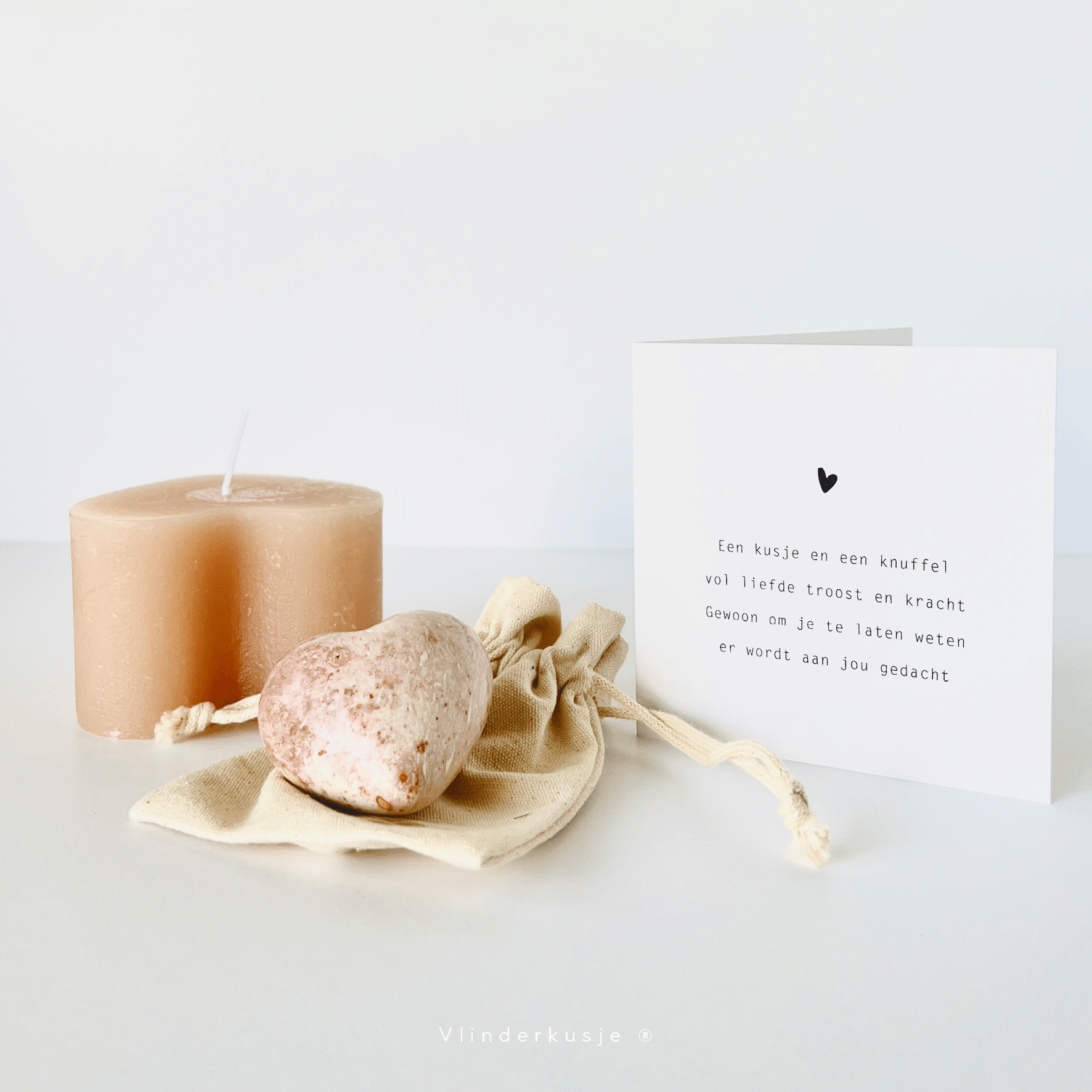Lief pakketje om iemand te laten weten dat je aan hem of haar denkt, met de keuze uit drie ansichtkaartjes met lief troostgedichtje. De kaartjes vind je bij de foto’s.