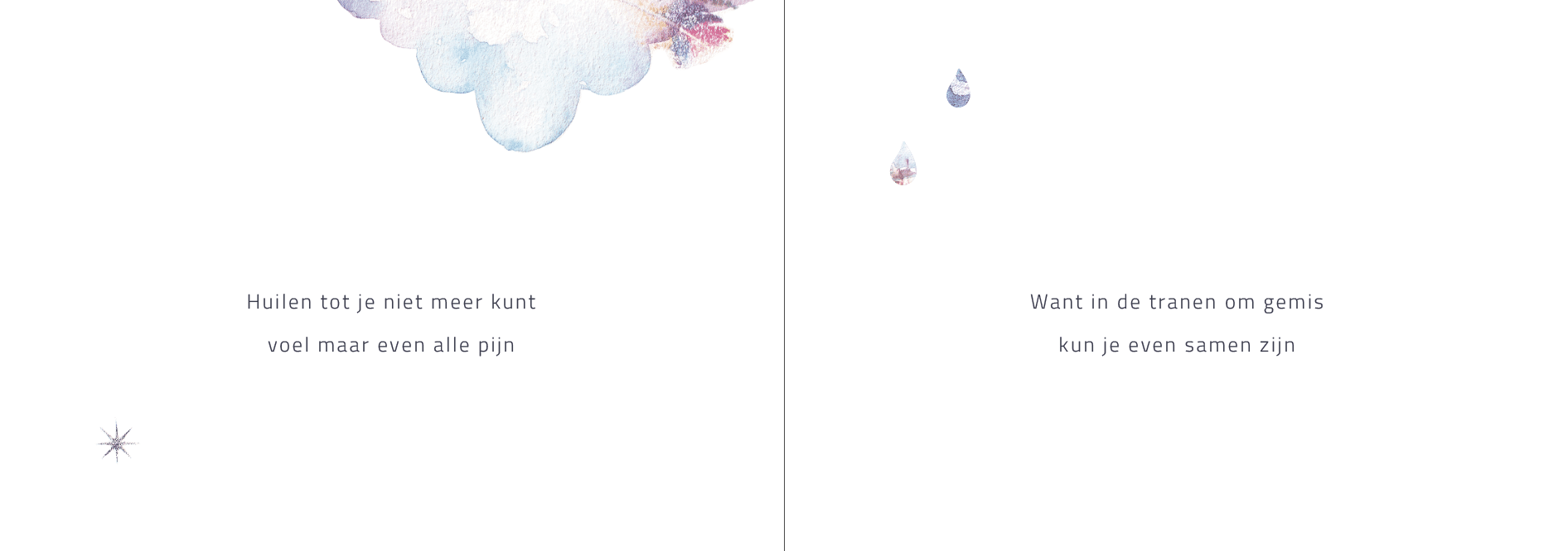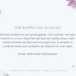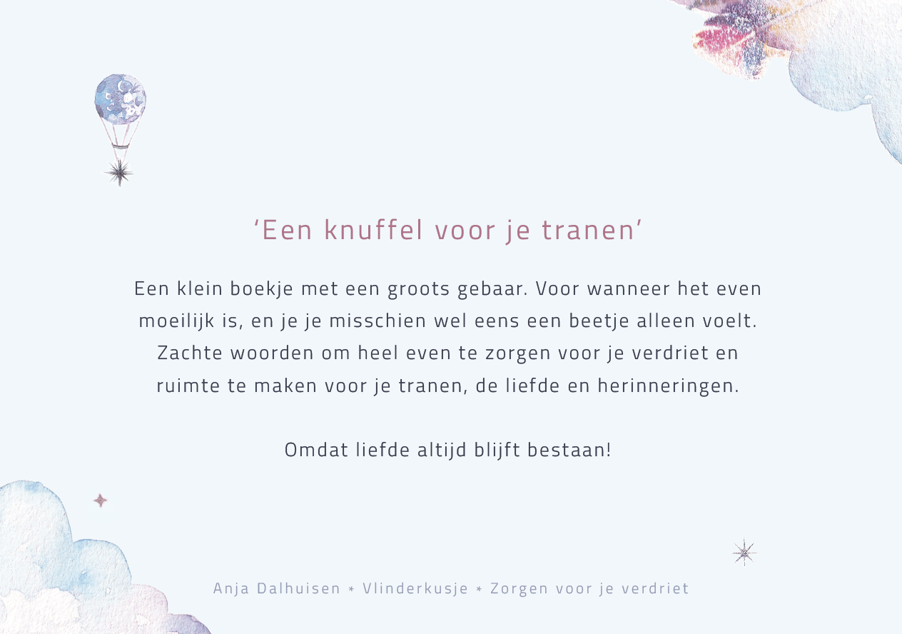 Een klein boekje bij verlies met een groots gebaar. Voor wanneer het even moeilijk is, en je je misschien wel eens een beetje alleen voelt. Zachte woorden om heel even te zorgen voor je verdriet en ruimte te maken voor je tranen, de liefde en herinneringen.
