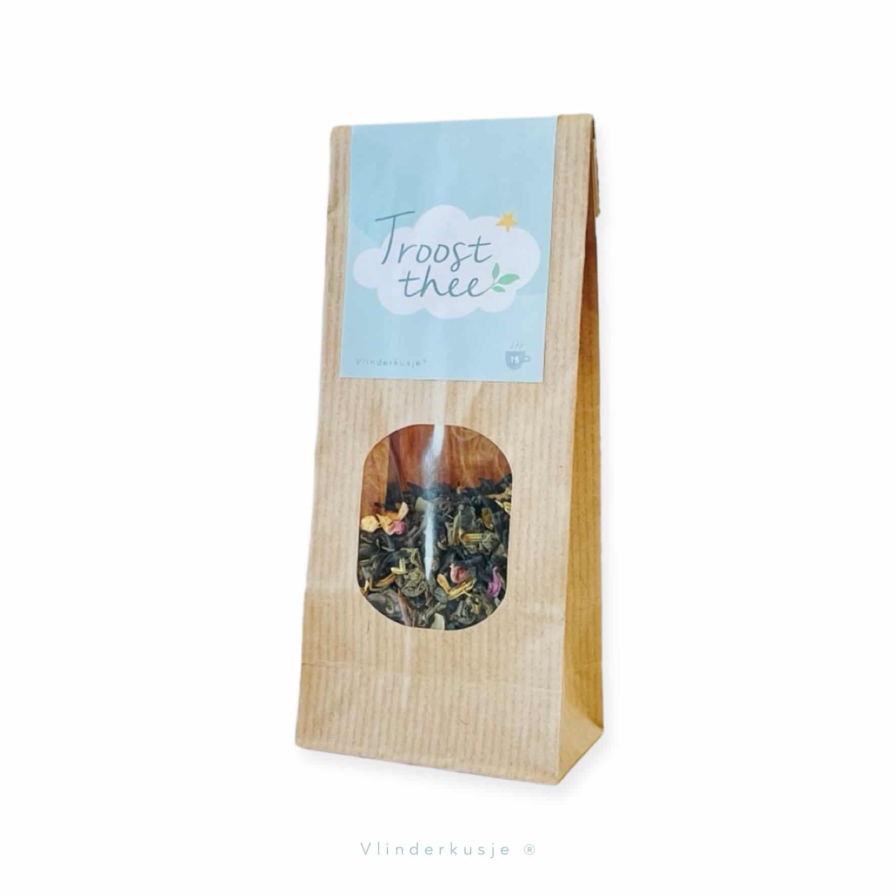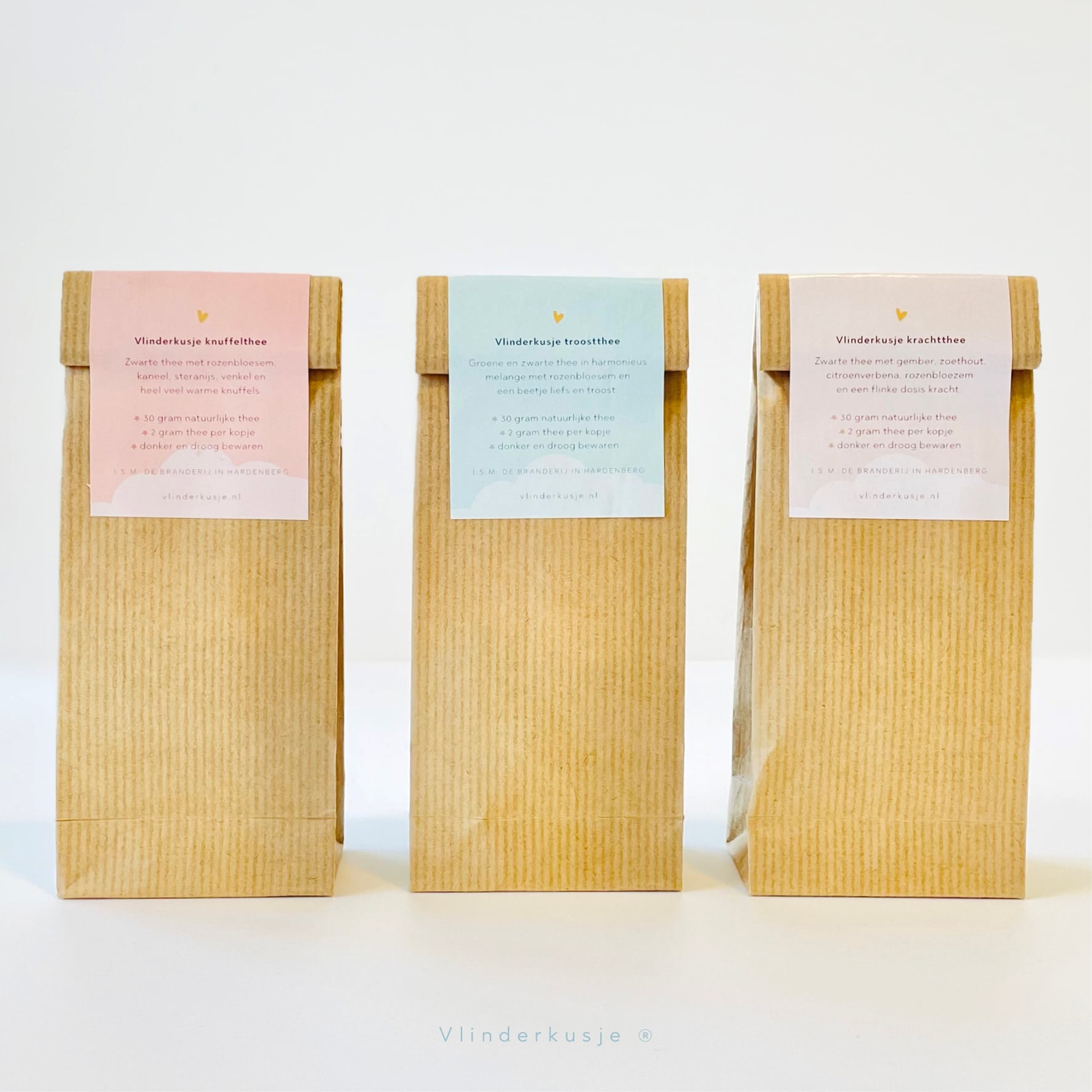 Heerlijke thee van Vlinderkusje voor speciale momenten. Je kunt kiezen uit drie soorten thee; Kracht-, Knuffel- en troostthee.