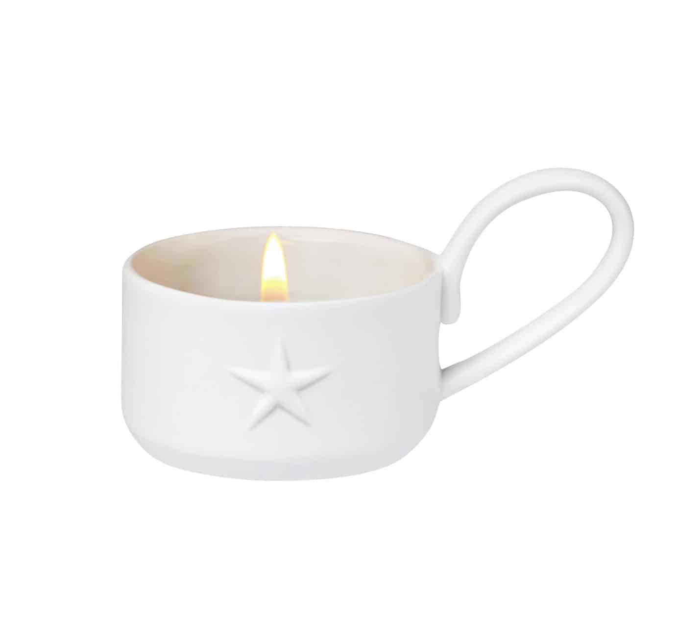Een waxinelichtje van mat keramiek met een handvatje en een sterretje erop.